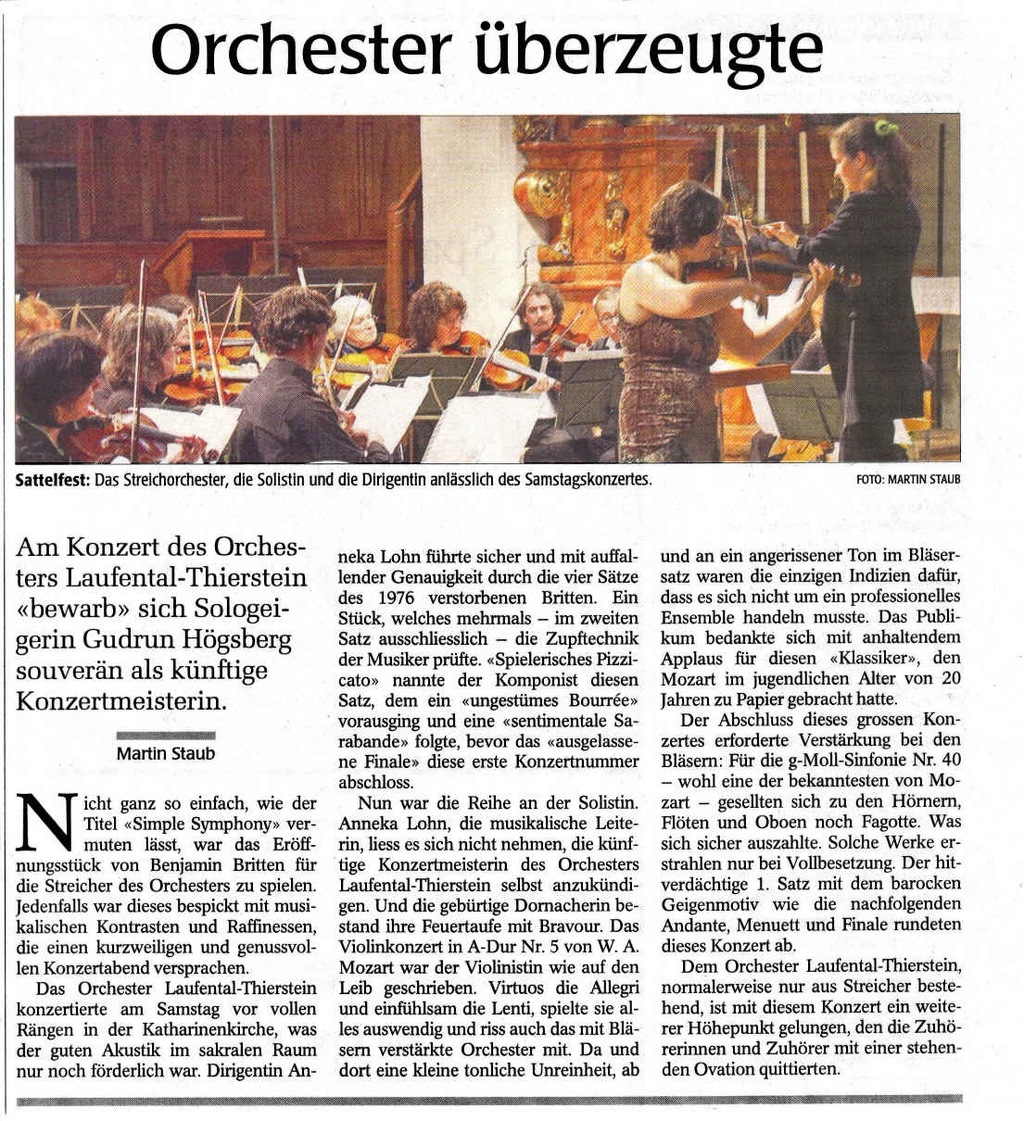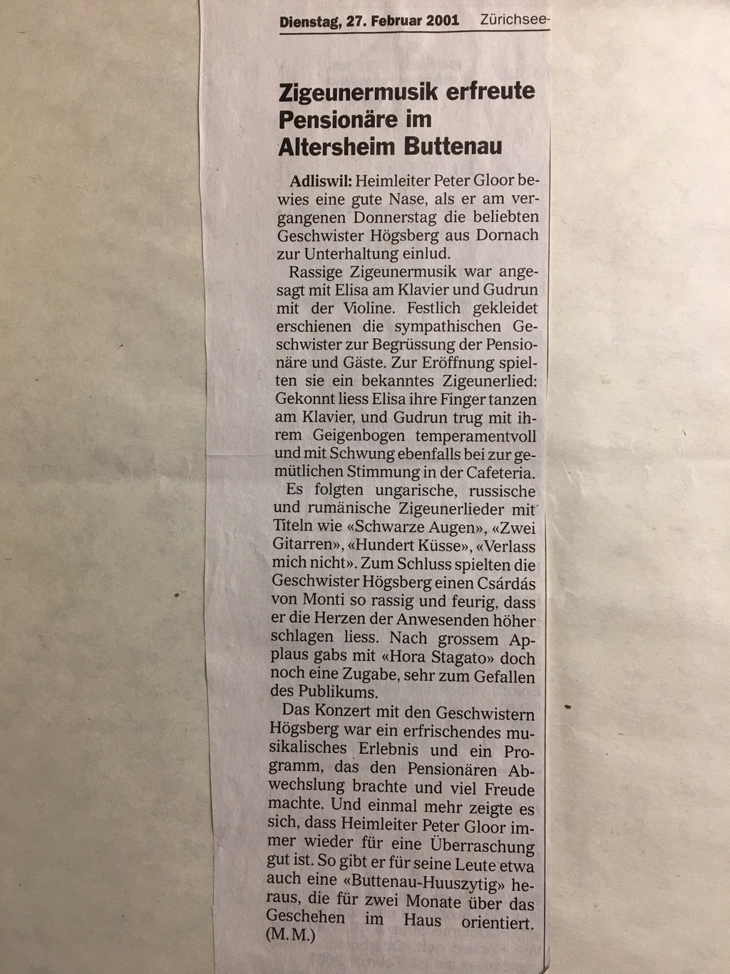 Eine gut disponierte Violonistin, Gudrun Högsberg, wartete zusammen mit ihrem musikalischen Partner am Klavier, Marino Giuliani, mit einem abwechslungsreichen Programm auf. Ludwig van Beethoven, Antonin Dvorak und Camille Saint-Saëns waren die Komponisten, die höchste Konzentration erforderten und in einwandfreier, hoch musikalischen Art und Weise wieder gegeben wurden.